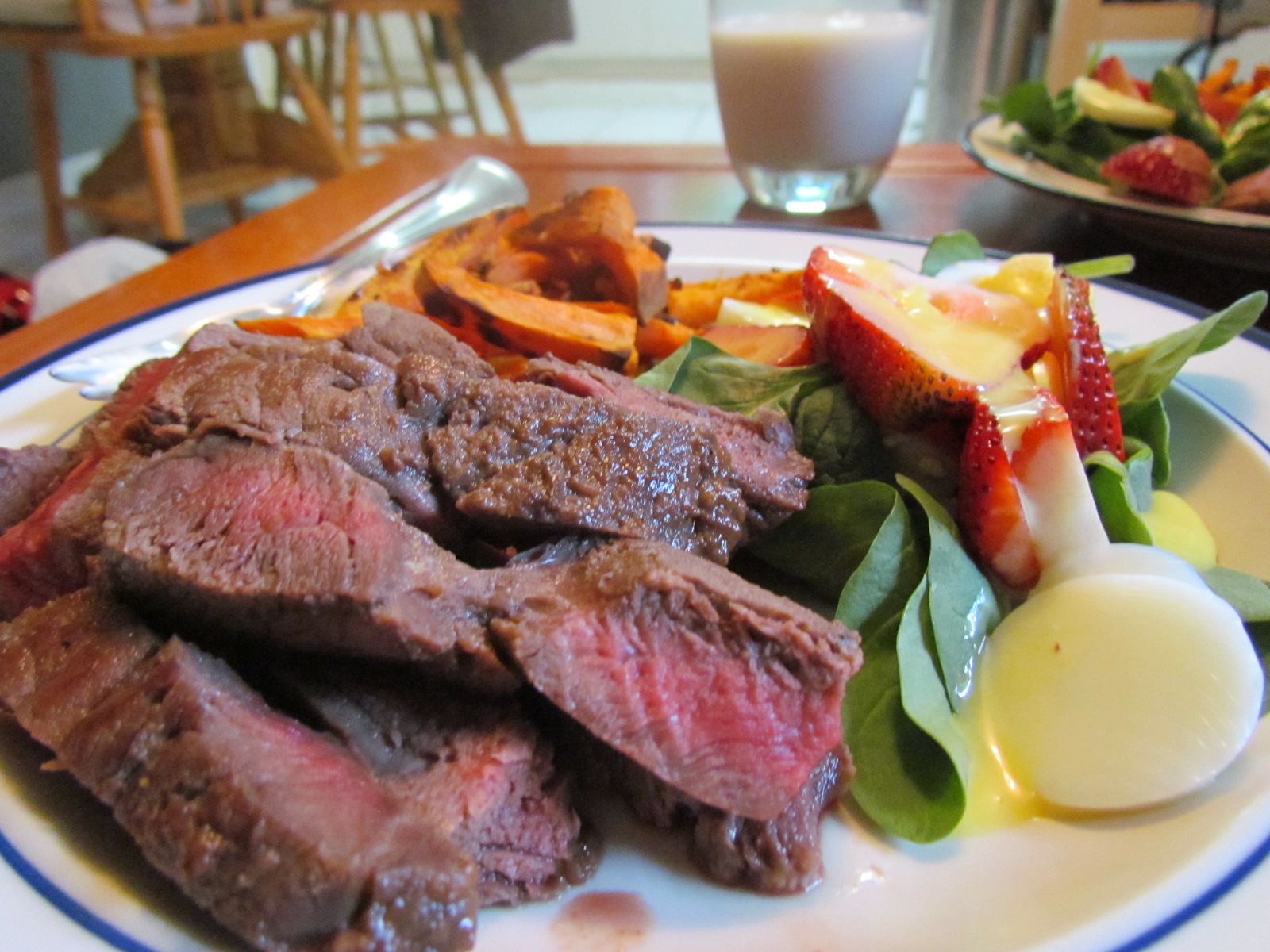Само название стриплойн говорит о качествах конечного блюда – в меру жесткая лосятина с невероятно насыщенным специфическим вкусом, который присущ красному мясу диких животных. Кстати, корейку из сохатого можно не только пускать на стейки, но и запекать, а также делать вкуснейшие супы. Чтобы убрать жесткость, лосятину маринуют, используя белое вино, рассол из-под огурцов или квашенной капусты. А вот с солью нужно постараться не переборщить. Дело в том, что помимо яркого вкуса лосятина, равно как красное мясо всех представителей отряда оленевых, уже насыщенно большим количеством солей. Приятного аппетита!