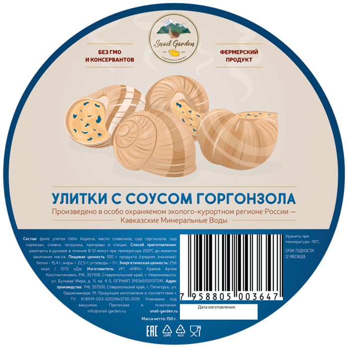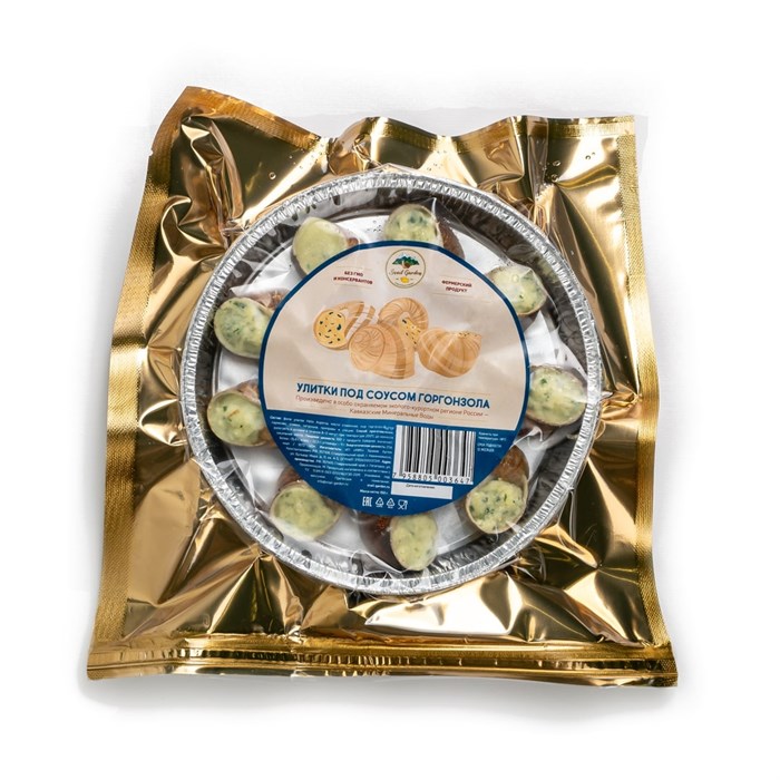 Улитки под соусом горгонзола — это оригинальное блюдо, для готовности которого достаточно 10 минут. Экзотический набор упакован в форму для запекания. Вкус деликатеса особенно придётся по душе любителям голубых сыров и средиземноморской кухни. Нежное, плотное и сочное мясо улиток напоминает мидии, обеспечивает продолжительное чувство сытости и абсолютно не отяжеляет желудок.