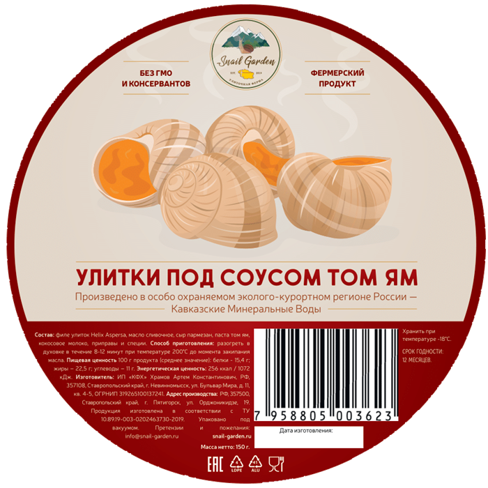 Состав: Филе улиток Helix Aspersa, масло сливочное, сыр пармезан, паста том ям, кокосовое молоко, приправы и специи.